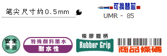 笔尖: ● 不锈钢 滚珠: ● 0.5毫米钨碳滚珠 线幅(毫米): ● 约0.3毫米 墨水原料: ● 水性颜料中性墨水 书写长度(米): ● 900 保存期: ● 黑色5年;蓝色、红色,普蓝色3年 笔芯: ● UMR-85(3种颜色/黑色、蓝色、红色、普蓝色)